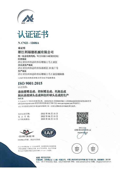 浙江利福德機械有限公司座落于中國大陸新世紀、新千年第一縷曙光首照地——溫嶺。是專業(yè)生產(chǎn)汽車懸掛擺臂總成、托架總成、球頭總成、襯套、后橋等系列產(chǎn)品等系列產(chǎn)品的大型汽車零部件制造企業(yè),遠銷歐、美及世界各地區(qū)。公司創(chuàng)建于1992年,現(xiàn)有兩個廠區(qū),A廠區(qū)位于溫嶺市石塘鎮(zhèn)上馬工業(yè)區(qū),B廠區(qū)位于溫嶺市東部新區(qū)23街7號,二十多年來一直奉行“顧客滿意”的宗旨,“人本管理、誠信經(jīng)營、注重品質、力求雙贏”的理念。依靠科學管理、先進技術、優(yōu)質產(chǎn)品和服務,贏得了國內外客戶的好評,產(chǎn)品遠銷歐、美等世界各地。