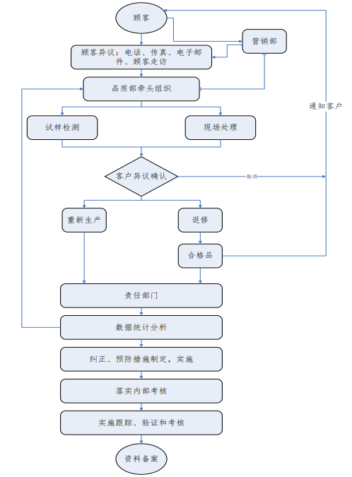 銷售部負責接收、收集顧客的抱怨/投訴,將顧客的意見記錄,通過客訴處理記錄或顧客專用格式,將相關信息傳遞到品質部,品質部接到顧客投訴反饋信息后,立即組織相關人員對可疑產(chǎn)品進行區(qū)分隔離:①區(qū)分隔離的可疑產(chǎn)品包括在制品,成品倉庫,發(fā)運的在途品,外庫存,涉及到外協(xié)件和原材料的應包含原材料庫和相應的分供方;②品質部組織相關人員根據(jù)異常情況,確定臨時措施,對可疑不合格品進行檢查、返工、返修或者報廢處理;必要時,填寫《客訴處理報告單》;③在24小時之內把相關信息返回到顧客。